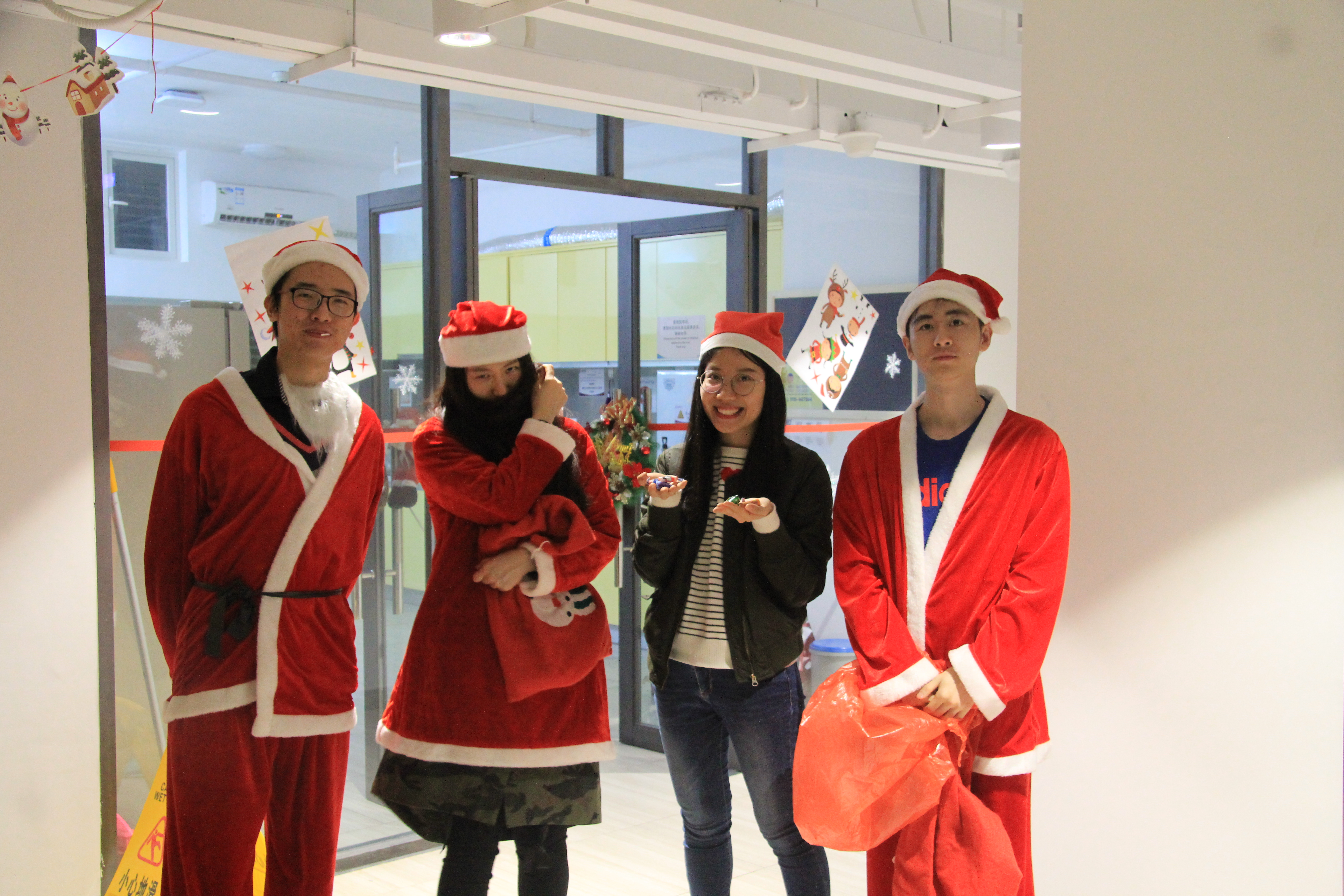 帮助书院把礼物送到每间宿舍的圣诞特派员:Brigitta(tutor),Angela(tutor),李治(tutor),姜易函(2016级人文学院)